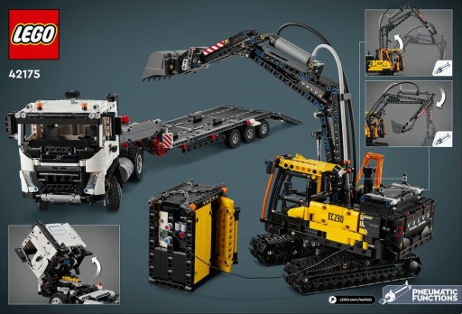 - Hoofdfeatures: Realistische Volvo‑stijl vrachtwagen met oplegger en volledige bouwbare graafmachine; robuuste Technic‑constructie