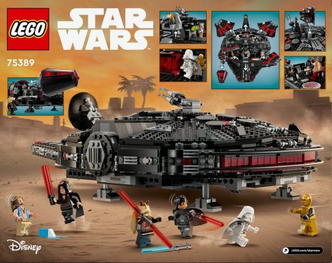 - Wat zit er in de doos: Onderdelen voor de Dark Falcon met afneembare cockpit en interieur; 6 minifiguren (Darth Jar Jar, premiejager C‑3PO, Darth Dev, Darth Rey, Strand Luke, Jedi Vader); lichtelementen en accessoires (lichtzwaarden, pak blauwe melk, en meer)