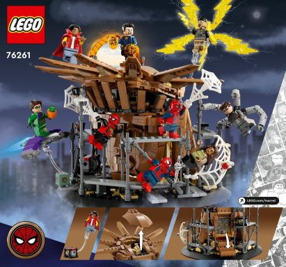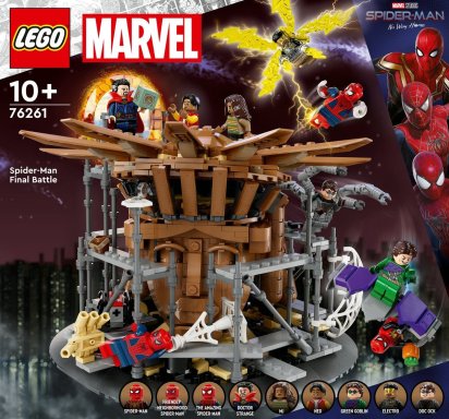 - Wat zit er in de doos: Onderdelen voor de Spider‑Man eindstrijd (76261) met minifiguren van Tobey Maguire Spider‑Man, Andrew Garfield Spider‑Man, Tom Holland Spider‑Man, Electro, Doctor Strange, Green Goblin, Ned, MJ en Doc Ock
