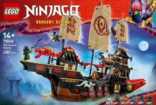 - Wat zit er in de doos: Onderdelen voor De Tempel Bounty schip met displaystandaard, 6 minifiguren (Zane, Cole, Wyldfyre, Nya, Rogue, Zarkt), wapens, onthullingszwaard en accessoires