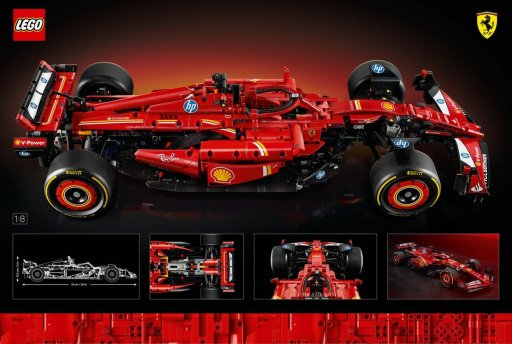 - Wat zit er in de doos: Bouwbare Ferrari SF‑24 F1 auto schaal 1:8; motorkap; V6‑motor met draaiende MGU‑H; versnellingsbak met 2 versnellingen; verstelbare spoiler; instructies