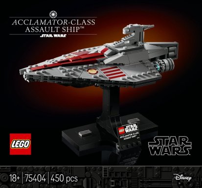 - Hoofdfeatures: Kenmerkende romp- en brugdetails van de Acclamator‑klasse in schaal‑getrouwe LEGO‑stijl; stevige constructie voor display