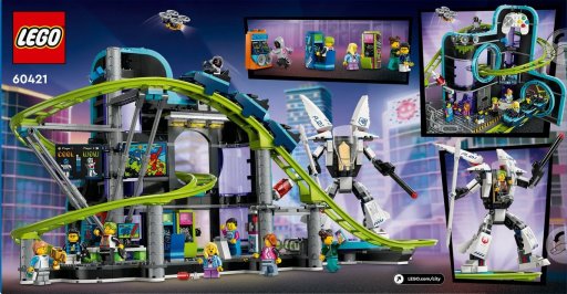 - Wat zit erin: bouwstukken voor achtbaan; afneembare speelgoedmecha; 3 karretjes; 8 minifiguren