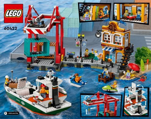 - Inhoud doos: vrachtschip, 2 vrachtcontainers, werkende containerkraan, haven met winkel en restaurant, waterscooter, bootje en 8 minifiguren